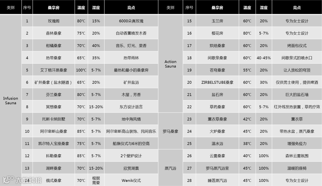 28种桑拿房分布在主楼和桑拿花园内,这些桑拿各具特色,既包括以传统技法及文化体验为主的芬兰桑拿、俄罗斯桑拿,也包括以美容诉求为主的热带桑拿、玫瑰桑拿,还有以冒险体验为主的高温桑拿、烘焙桑拿等。