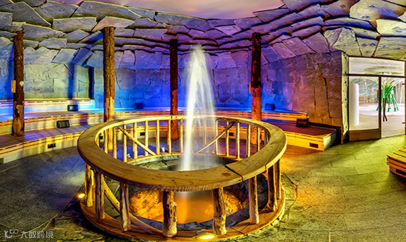 间歇泉桑拿:桑拿的喷水口以间歇泉的形态进行巧妙设计,以维持桑拿房湿度,四周使用真正的青石板材和原始的杉木,配合灯光与音乐形成奇妙的间歇泉桑拿体验。