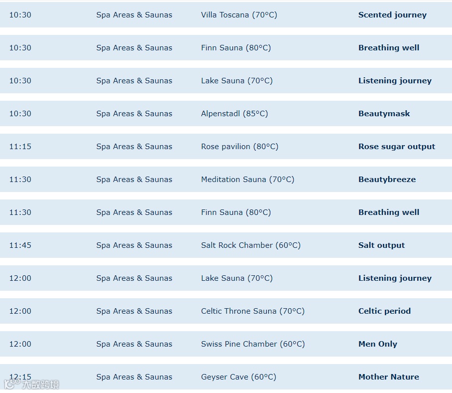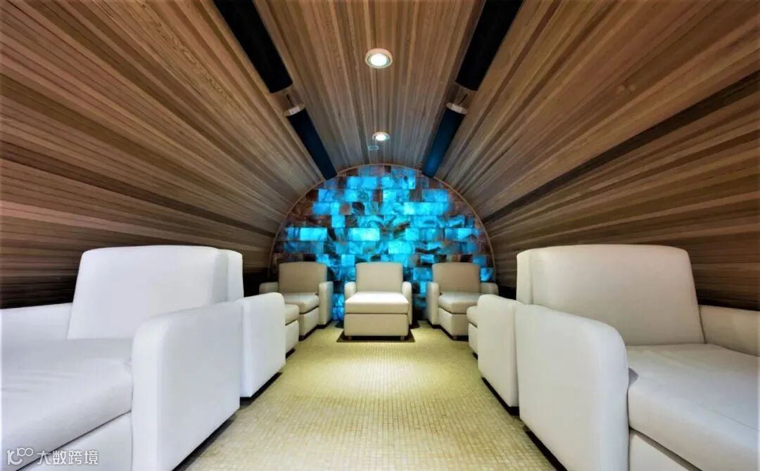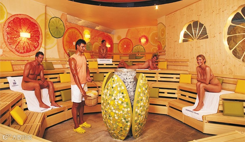 柑橘桑拿:桑拿房以水果为主题元素进行设计,并提供柠檬、橙子、橘子、柚子等水果精油,形成独特的芳香氛围。室温维持在70℃,同时还有冰淇淋供享用。