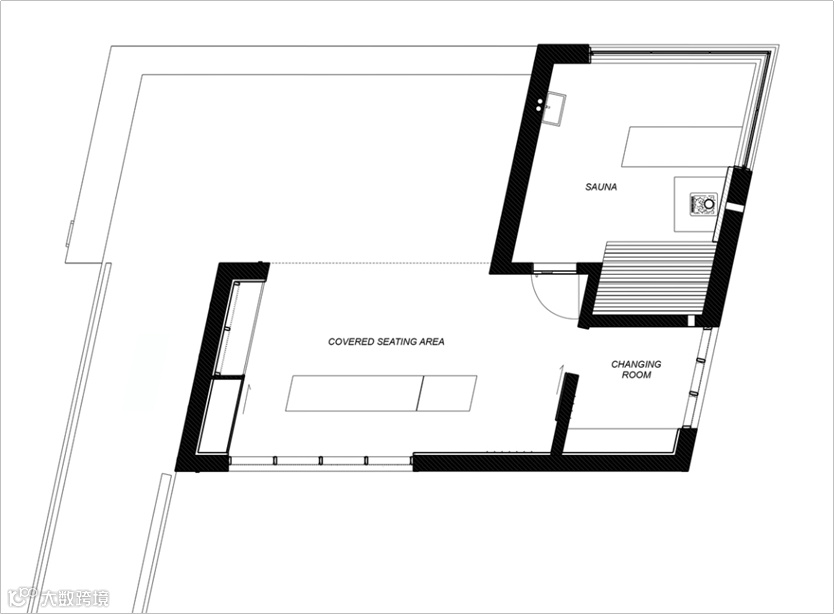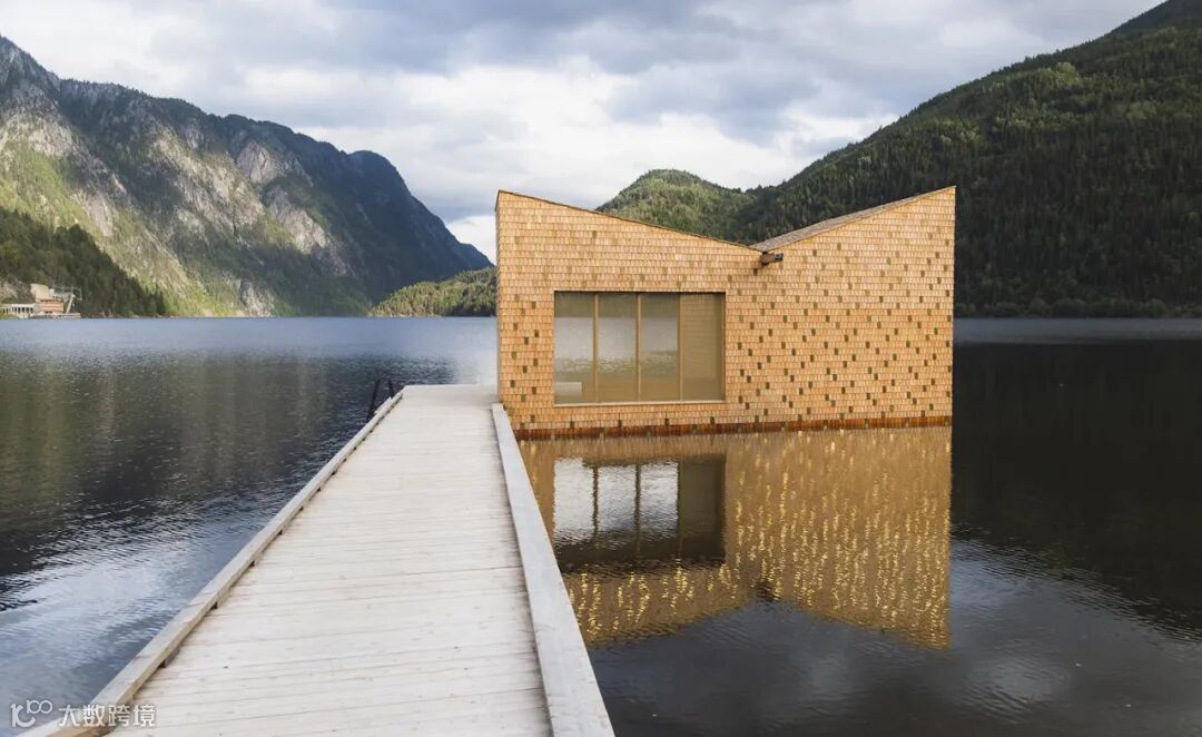 桑拿屋棱角分明的多边形轮廓与周围群山形成鲜明对比,该结构的轮廓特征是对班达克湖周围陡峭山腰的建筑诠释。桑拿房的外部被金色包裹,在崇山峻岭之中好似宝石一般。金色的木瓦覆层参考了传统的建筑技术和当地的民间传说,金色也暗示了旧定居点的质朴特征与达伦酒店的精致之间的对比。