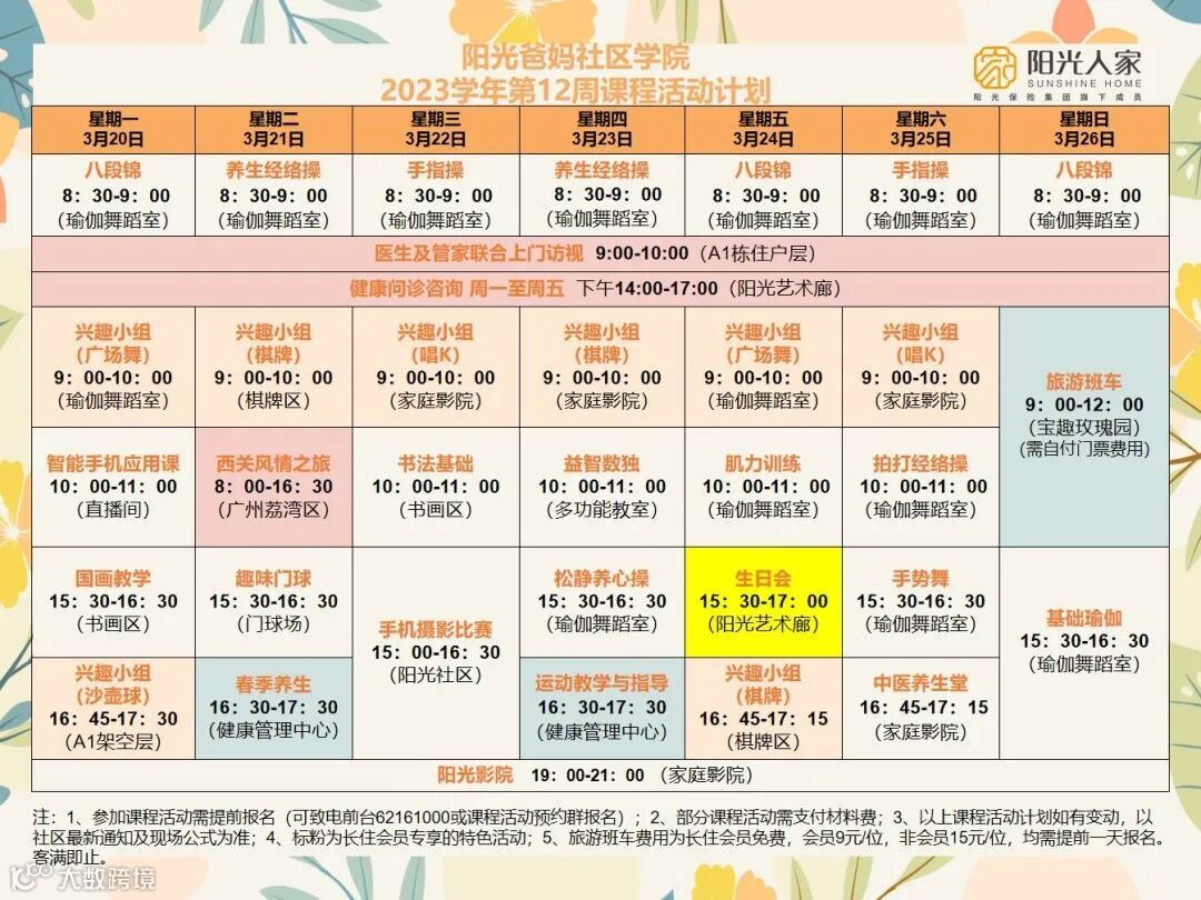 阳光人家,有趣有盼,第十二周课程活动计划上新啦,阳光爸妈社区学院精彩课程活动每天都在火热上演,欢迎各位阳光爸妈前来康养入住体验!