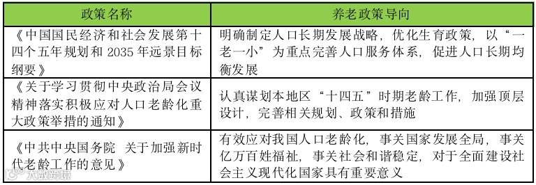 养老政策战略性加码,养老红利加速到来。2021年养老政策总基调为积极应对人口老龄化。作为十四五首年,国家层面连续发布积极应对人口老龄化国家战略举措,明确十四五期间以“一老一小”为重点完善人口服务体系,完善养老服务体系,积极培育银发经济,推动养老事业和养老产业协同发展。至此,养老产业进入“精准发力、多措并举”新阶段,养老行业迎来发展新机遇。
