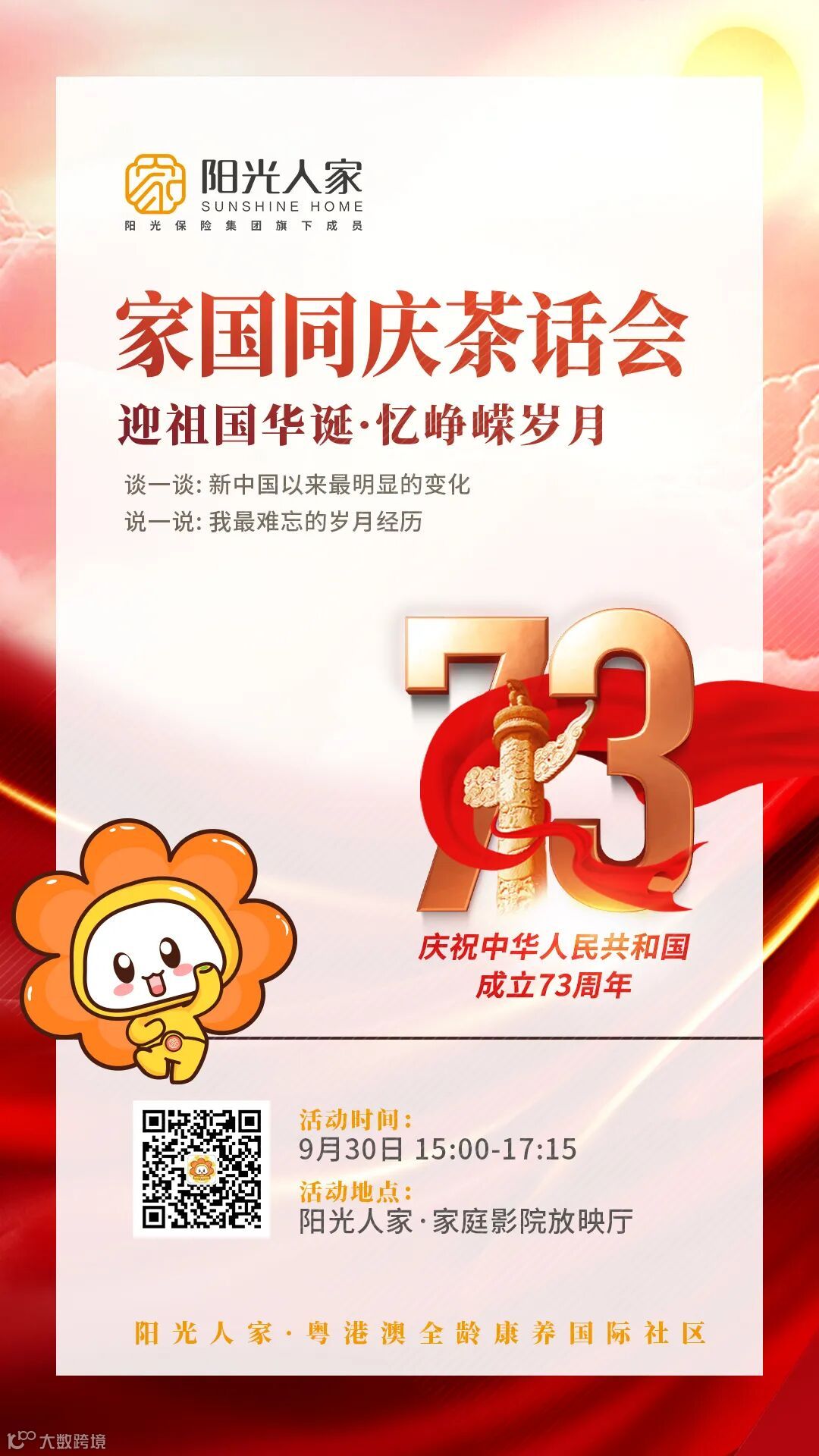 2022年9月30日下午,是日国庆前夕,值此国庆到来之际,阳光人家·粤港澳全龄康养国际社区特别举办了“迎祖国华诞·忆峥嵘岁月”家国同庆茶话会活动,让各位阳光家人们齐聚一堂,喜迎国庆,共话家里情。
