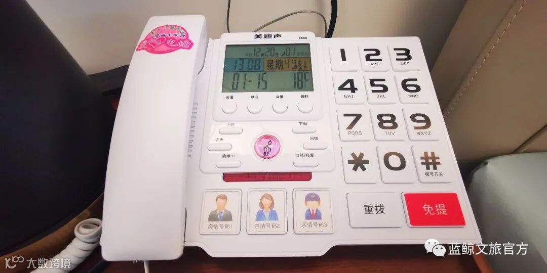 还有这个大字电话,尤其对眼部有疾病或年长的爷爷奶奶特别友好,一键拨通亲情号码,床头边还有紧急呼叫按铃,如遇困难,按下按钮,这里的管家会在3分钟之内出现在爸妈身边。
