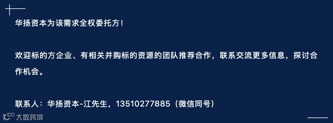 今日,我们为大家精选了1个上市公司并购需求。(注:更多融资、并购类项目信息,可关注“华扬资本”公众号)。