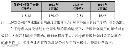 公司拟于 2022 年 3 月中旬将标的股票 12.00 万股过户至本持股计划名下,锁定期满,本持股计划按照前款约定的比例出售所持标的股票。经预测算,假设单位权益工具的公允价值以董事会审议本持股计划时最近一个交易日公司股票收盘价 26.54 元/股作为参照,公司应确认总费用预计为 318.48 万元,该费用由公司在锁定期内,按每次解除限售比例分摊,则预计 2022 年至 2024 年持股计划费用摊销情况测算如下: