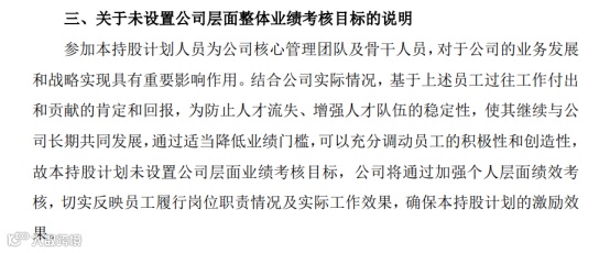 本持股计划与一般股权激励不同,公司未设置公司层面整体业绩考核目标,形成实质上的“零考核”持股计划,当然公司设置了个人层面绩效考核。