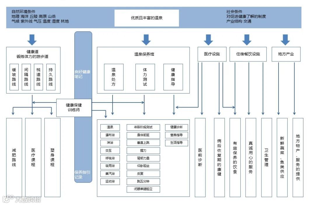 我们可以从“温泉与气候”这个原点出发,先将不同气候条件下的温泉分为不同的温泉康养体系,比如温泉与森林疗法体系、温泉与海洋疗法体系等。