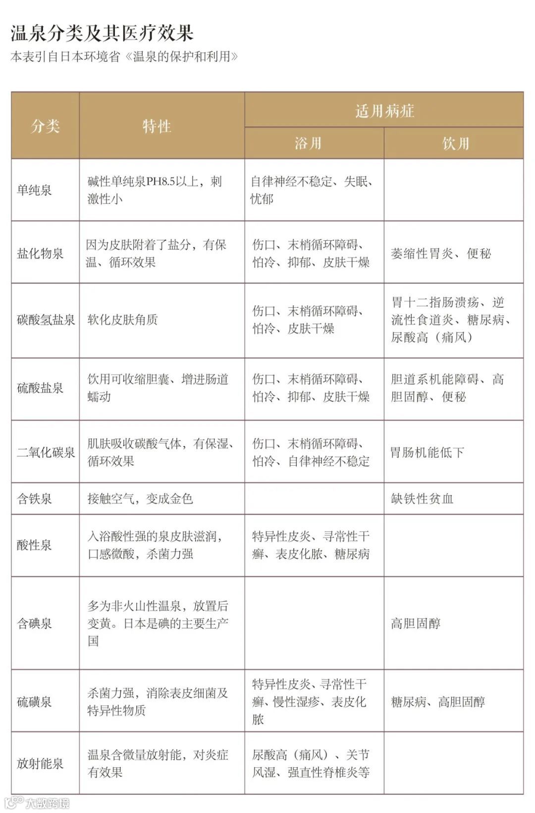 下表是日本环境省出台的《温泉的保护和利用》划分的10种泉质类型及其对应的疗效,供大家参考。