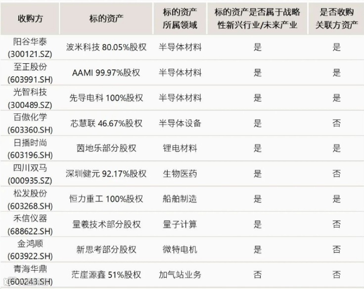 2.1 科技与新兴产业主导:半导体、新材料、新能源等领域的跨界并购占比最高,例如日播时尚布局锂电池业务、兴民智通新增船舶制造业务等。
