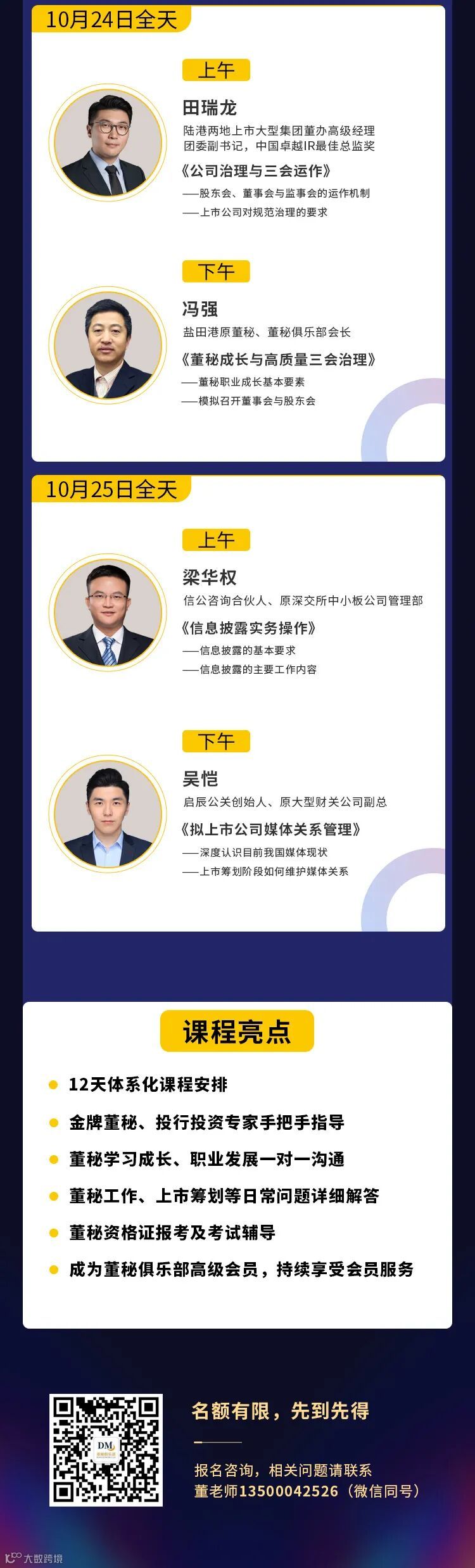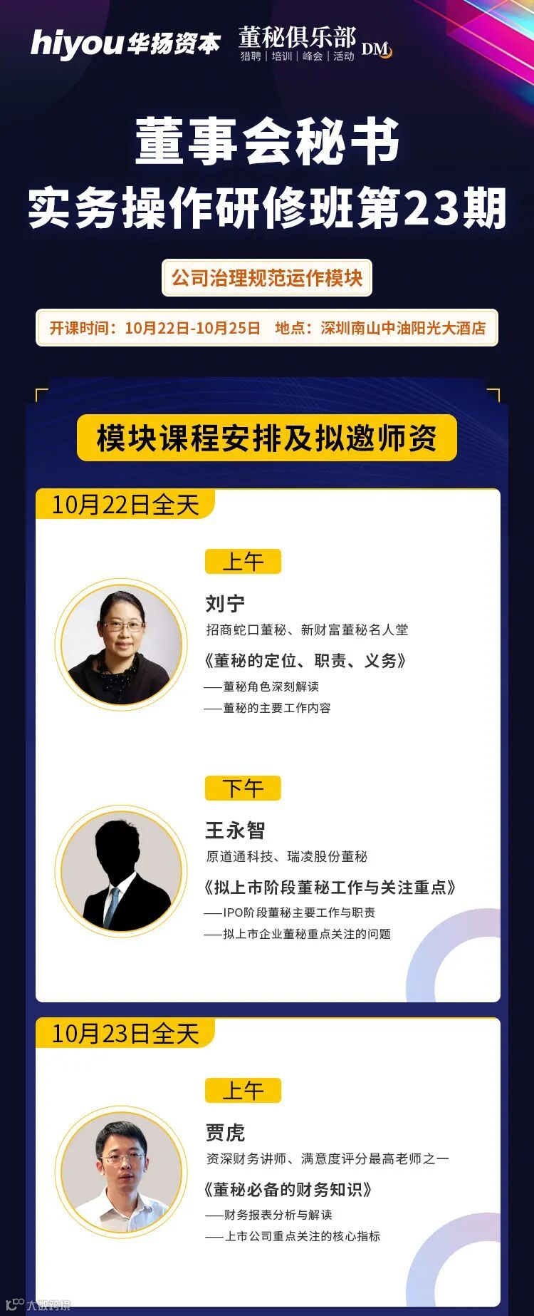 下一期课程,《董秘实操研修班》第23期第一模块,将在10月22-25日召开,欢迎大家来电了解更多信息。董老师:13500042526