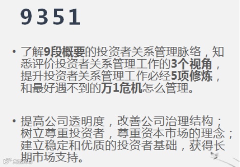 市值管理课程由资深券商研究员、现著名私募基金经理张总分享。结合近年来注册制对资本市场的影响,张老师总结出投资人眼中的“四好公司”:大行业、大龙头、高壁垒、好题材,董秘要做的工作不仅仅是挖掘题材,而是从企业内在价值出发,通过有效的投资者管理与媒体关系,充分利用不同的资本运作工具,来实现市值的稳步提升。作为二级市场的资本研究员,张老师还通过多个成功与失败的案例,来深度剖析市值管理的关键要点,整个课程干货满满。