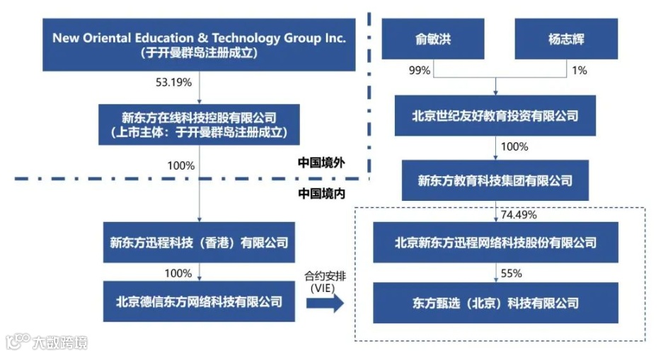 东方甄选(北京)科技有限公司成立于2021年12月7日,是北京新东方迅程网络科技股份有限公司的控股子公司,而北京新东方迅程网络科技股份有限公司由新东方在线科技控股有限公司的全资子公司北京德信东方网络科技有限公司协议控制(VIE)。我们可以先看如下股权架构: