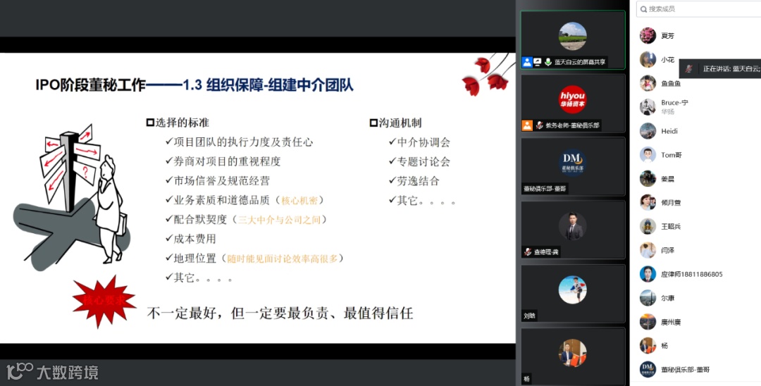 在董秘的主要工作模块中(从IPO到上市),陈老师在组建中介团队方面,通过选择标准和沟通机制两个方向,进行详细讲解。同时陈老师也提到了其中的核心要求:不一定最好,但一定要最负责、最值得信任。