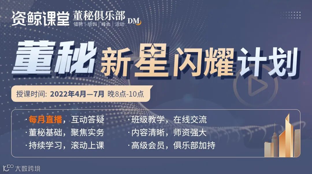 由于受疫情以及广大学员要求,董秘俱乐部特限时(4月-7月)推出线上直播课程《董秘新星闪耀计划》,课程特邀行业大咖全程直播讲授,干货满满!