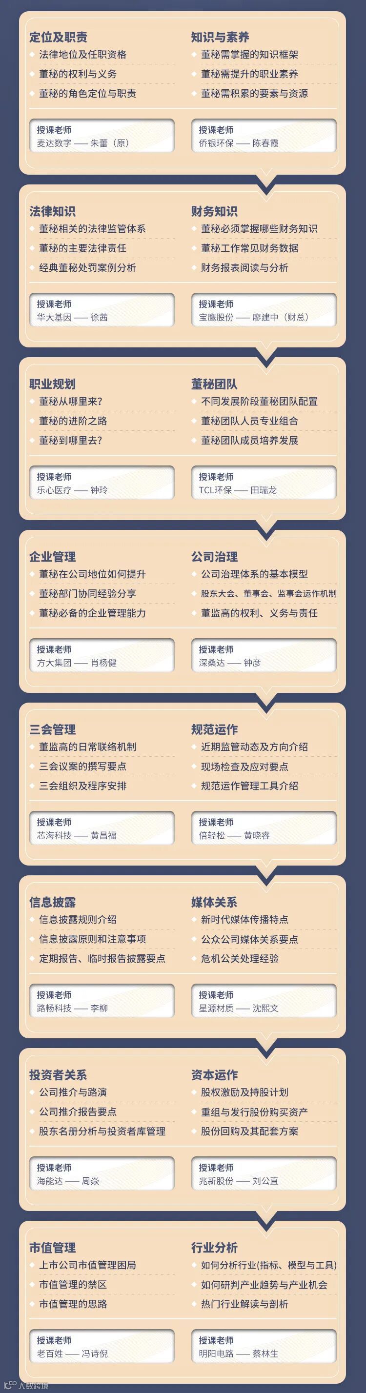 课程特邀16位行业大咖进行授课,均由董秘俱乐部课题组精心选择,授课老师皆具有深厚理论功底及丰富实践经验。如华大基因—金牌董秘 徐茜;侨银环保—金牌董秘 陈春霞;深桑达—金牌董秘 钟彦等!