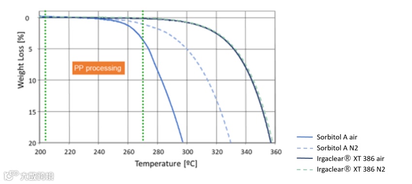 我们常说的消费后回收塑料(PCR),总是难以回避气味问题,而这些气味一部分来自挥发性有机化合物(VOCs)。这是限制回收塑料应用范围的主要因素之一。有一些添加剂本身会引入气味。 这里我们通过热重分析(TGA),告诉我们在不断升温的过程中,挥发性物质流失而导致的质量损失。对不同类别的透明剂进行比较,可以显示出Irgaclear® XT 386的卓越热稳定性,在280°C之前没有任何降解或挥发迹象,这已超出了聚丙烯的常规加工温度范围。