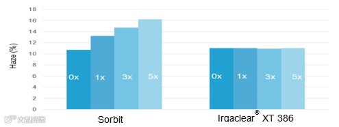 实际上,回收塑料中往往会有一些透明剂的残留物,再次添加也许会引入或增加复杂性,难以实现所需的性能。研究显示,Irgaclear® XT 386与常规的透明剂相比,对回收塑料的雾度方面具有优势。因此,巴斯夫的Irgaclear® XT 386技术在多个方面促进了透明聚丙烯的可回收应用性,同时为选择聚丙烯废料来源提供了最大的灵活性。