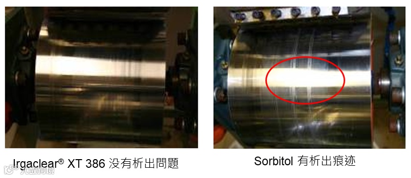 图1: 经过3小时的生产后,低添加量的效果显着。左边使用Irgaclear® XT 386 可以有效防止添加剂在加工过程中沉积在机器表面,从而减少清机工作,增加设备运行效率