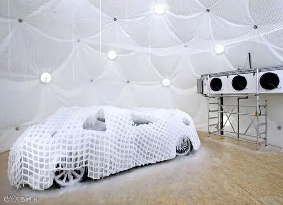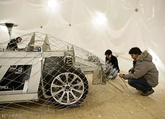 埃利亚松是一位以自然为创作元素的艺术家,他受邀参与创作BMW第16辆艺术车,对H2R产生了浓厚兴趣。他抛弃了传统的艺术车创作方法,把两个叠加的金属反射层罩在车身上,并覆上一件易碎的“冰衣”,镂空的复杂“冰雕”中,隐约可见H2R坚韧的车架,但已经完全看不出这辆BMW本来的模样。