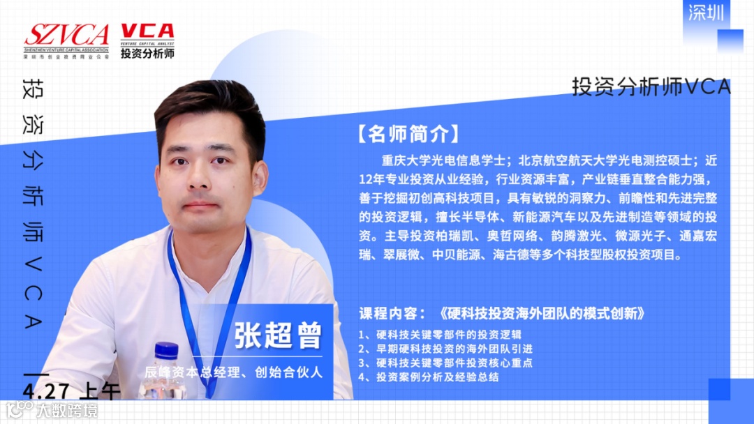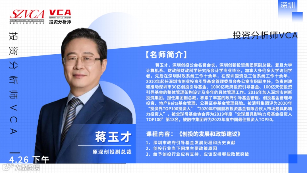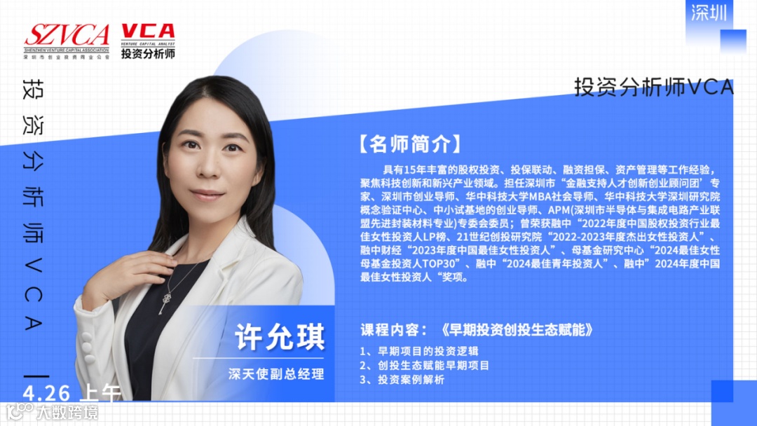 投资分析师VCA认证中心致力于培养并认证新时期股权投资精英人才,联合深圳市创业投资同业公会发起投资分析师VCA股权投资证书实战班,依托创投公会丰富的创投资源和人脉圈层,汇聚最具实力的创投机构大咖,通过充分的学习和讨论,共筑股权投资新时代!