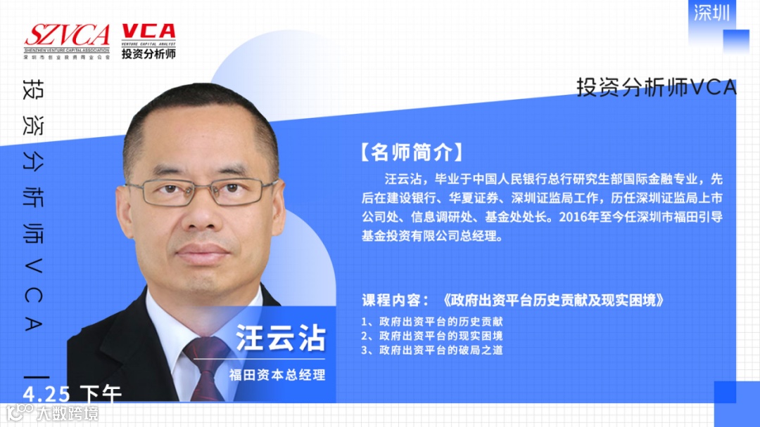 汪云沾老师,福田资本总经理,毕业于中国人民银行总行研究生部国际金融专业,先后在建设银行、华夏证券、深圳证监局工作,历任深圳证监局上市公司处、信息调研处、基金处处长。2016年至今任深圳市福田引导基金投资有限公司总经理。