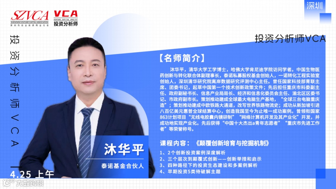作为一位创投行业的老兵,沐华平老师在本次课程中,从2个创新投资案例深度解析、三个层次到颠覆式创新——创新举措和启示、四种路径下的投资生态建设和多案例解析、早期投资5类待破解主题等多个角度对早期项目的培育与挖掘进行深入解读。