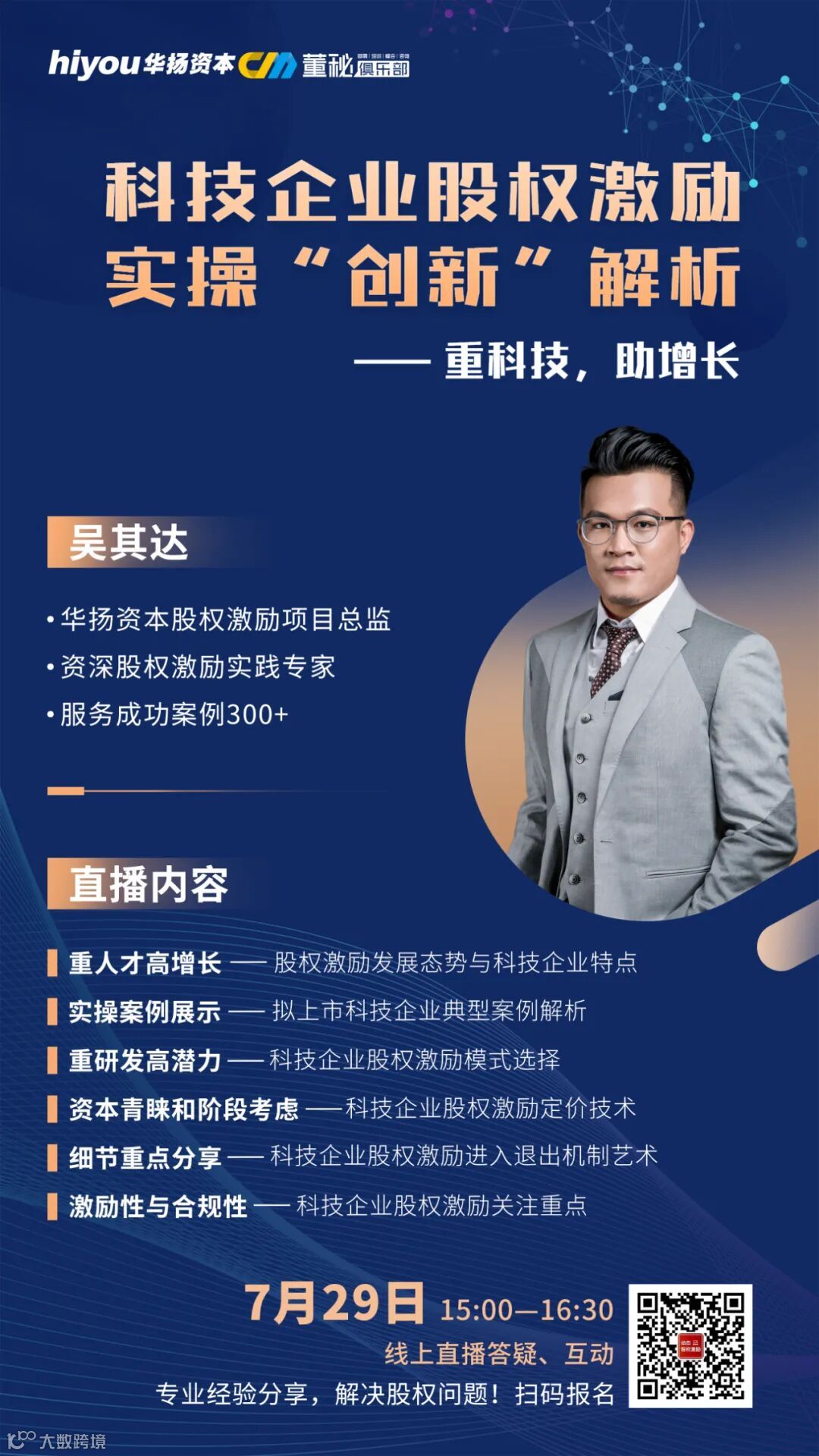 科技企业有哪些特点?又该如何进行股权激励呢?拟上市科技企业进行股权激励需要注意哪些关注重点呢?为分享专业经验和实操处理技术,华扬资本联合董秘俱乐部特举办拟上市企业股权激励实操专题系列直播课程,以便为拟上市企业答疑解惑。本次直播课程内容为:科技企业股权激励实操“创新”解析,欢迎大家参与和进行深入沟通交流。