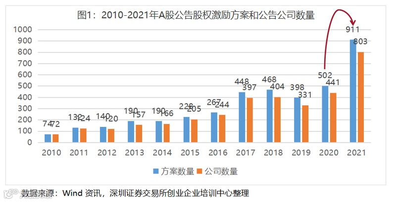 2021年公告股权激励的公司数从2020年的441家增加到803家,增幅达85.26%。有104家公司公告了2个或更多的股权激励计划,合计达到211个,占全部计划数量的23.16%。近期查看相关数据,我们发现上市公司进行股权激励的数量在加速增加。