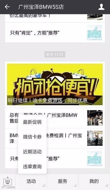 一.打开微信,找到广州宝泽BMW5S店并在菜单栏中选择【活动】,在菜单中选择【违章查询】。