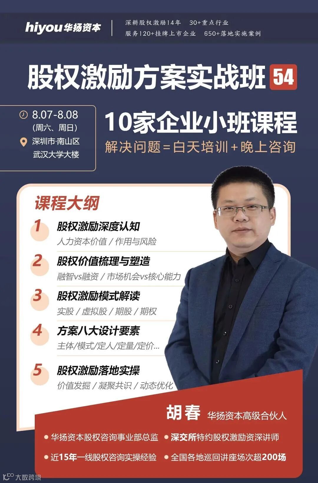 结合15年股权顶层设计、股权激励方案设计的实战经验,华扬开办了《股权激励方案设计实战班》,旨在为广大优秀企业家、高管人才普及科学的股权认知,分享股权激励方案设计的思路与技巧,助力企业资本价值提升!