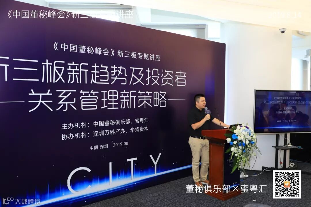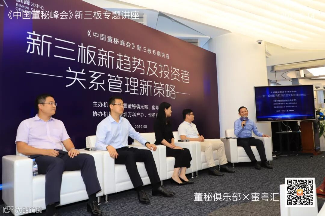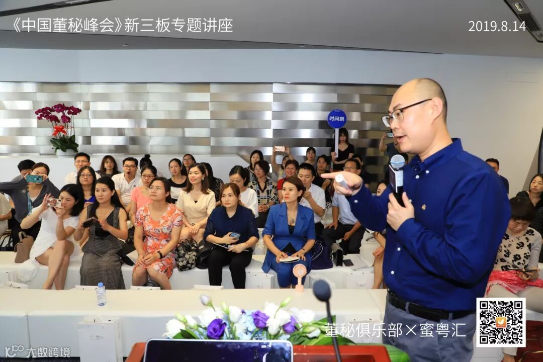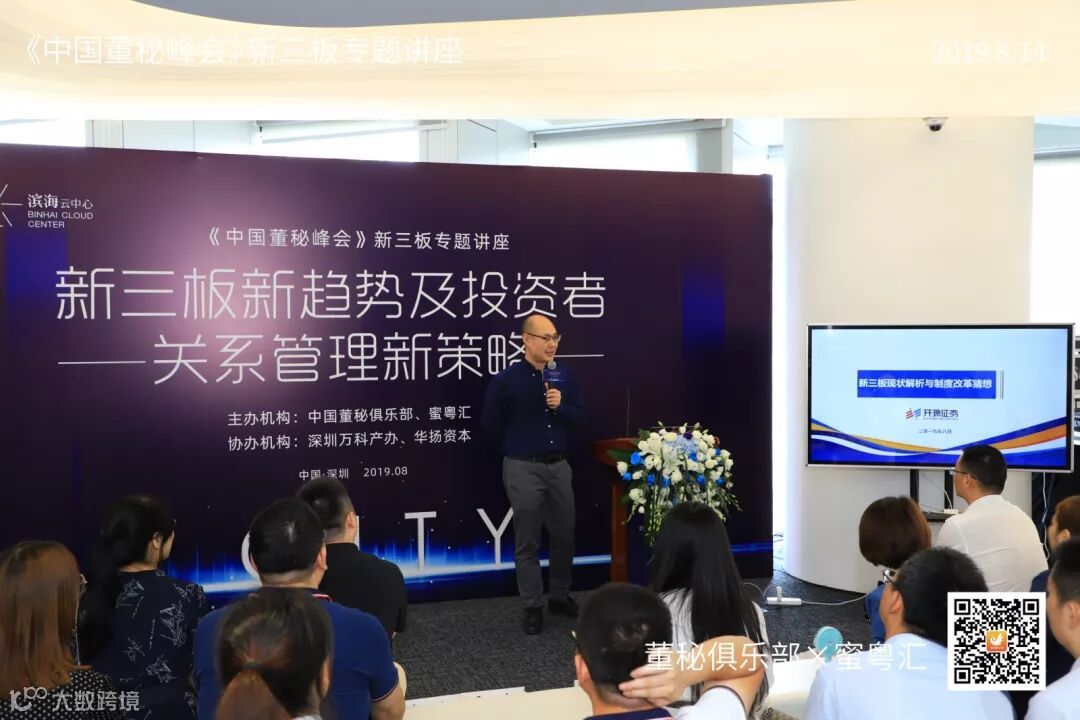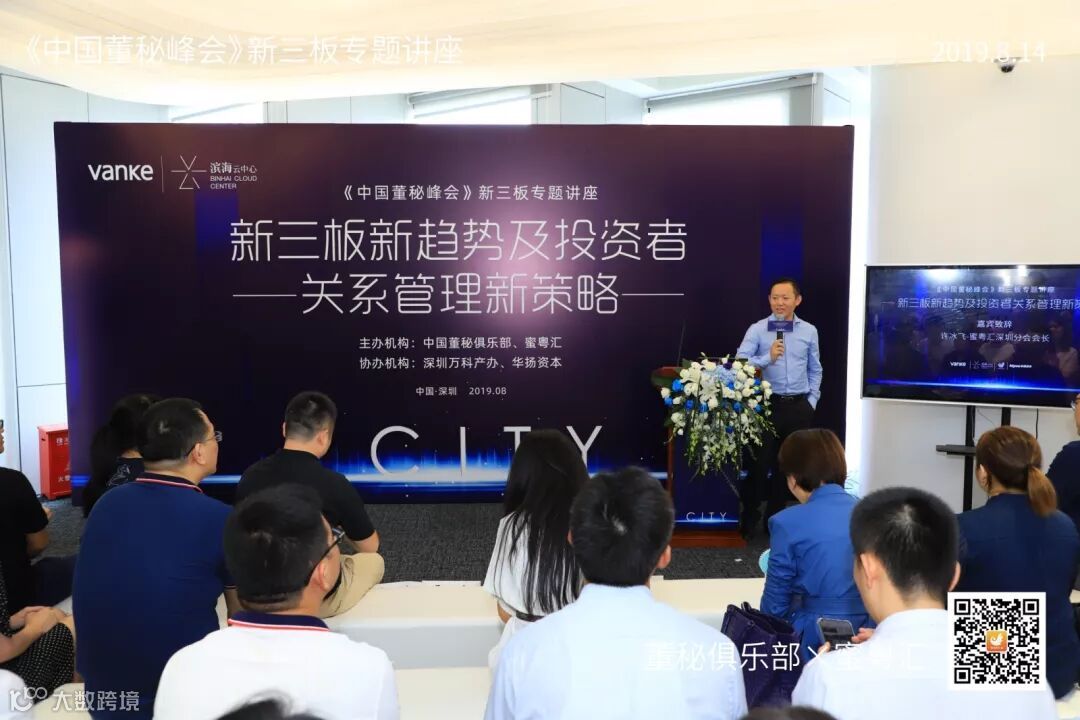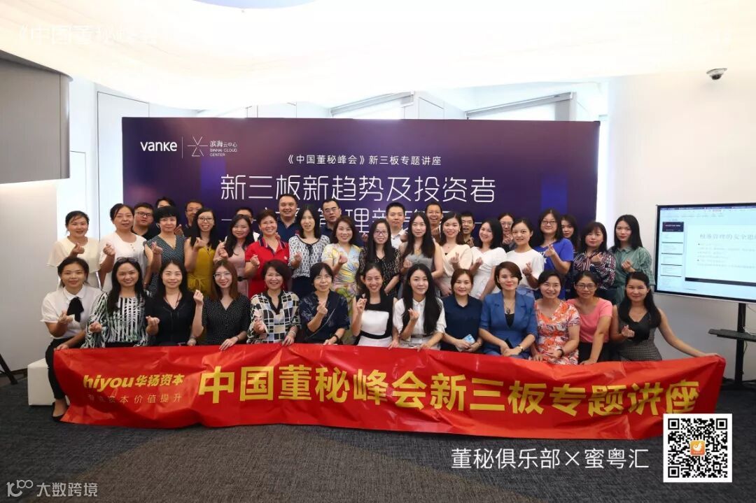 2019年8月14日,由董秘俱乐部联手蜜粤汇主办,深圳万科产办与华扬资本协办,中国董秘百人会大力支持的《中国董秘峰会》新三板专场活动,在深圳万科滨海云中心16楼隆重举行,共有40多位新三板企业董秘参加了本次学习交流。