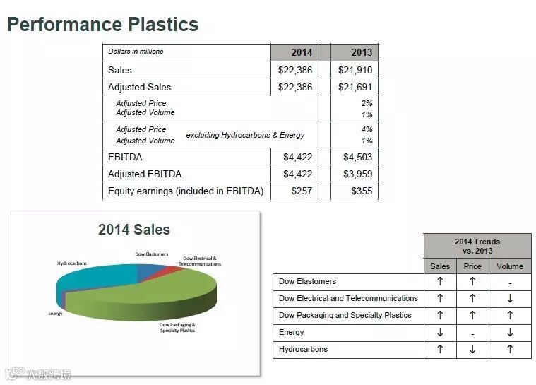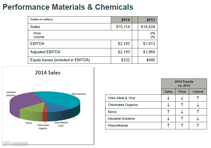 展望:2014年是不平凡的一年,我们通过MDI聚氨酯、高性能产品、先进材料等差异化业务实现了调整后EBITDA增加了2亿美元,我们正在加大一些增长项目的投资并预计在未来几年内将每年EBITDA都会增加200亿美元以上。