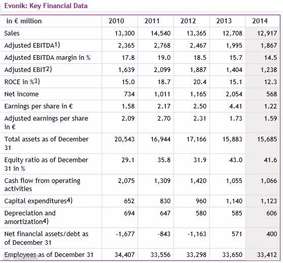 展望:赢创预计销售额将在2015年小幅上升,调整后EBITDA将较上一年有所提升,汇率会影响销售额和利润。若欧元/美元的平均汇率从今年初开始维持不变,则全年的销售额和调整后EBITDA将可能有所增长。