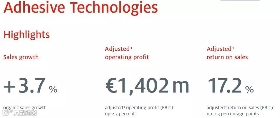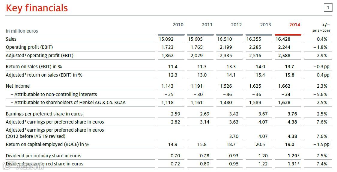 展望:汉高公司预计在2015财年可以实现3到5个百分点的有机销售额增长,相比2014财年,公司预计调整后销售回报率(EBIT)可以增至16%左右,而调整后优先股每股收益将会至10%左右。