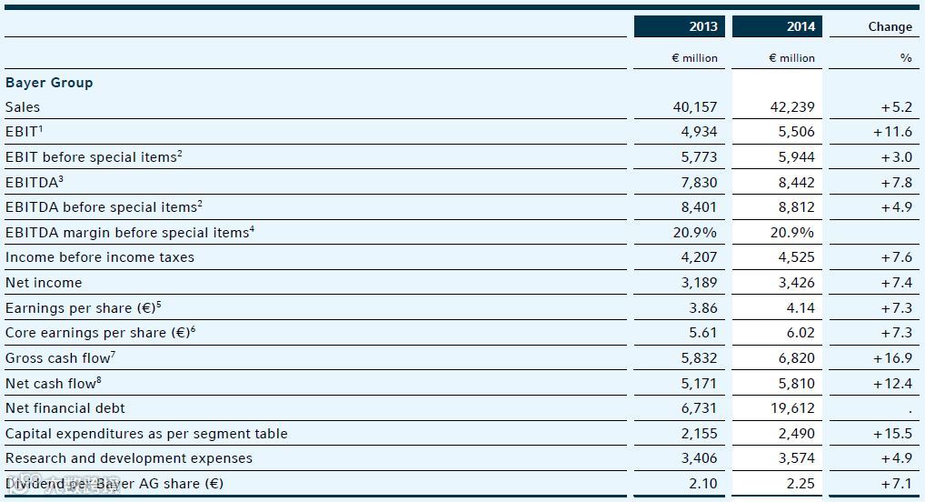 展望:2014年,拜耳集团在运营和战略方面取得了显著的成功。生命科学业务和材料科技业务不计特殊项目的销售额和盈利涨幅都增长显著。材料科技最迟将于2016年中期作为独立公司上市。生命科学业务通过重要的收购得以加强。戴克斯表示,2015年公司的目标是进一步实现销售额的增长和盈利的显著上升。