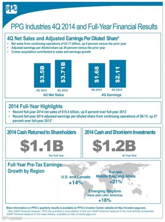 展望:未来两年2015&2016年,PPG工业依然有15-25亿美元现金用于收购项目和股票回购,依然有利于PPG工业的进行两个战略方向的部署,即优化细分市场结构,树立各个终端市场的领导地位;优化区域组合,提高新兴市场的占有率。