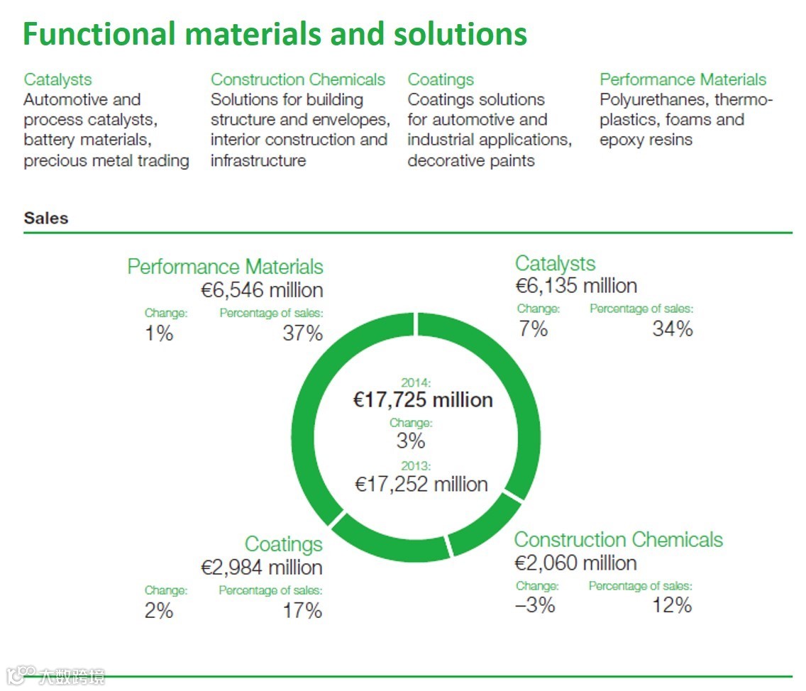 展望:全球经济将继续面临相当大的风险。在不断波动和充满挑战的环境中,我们希望2015年有良好的表现,并实现销售额小幅增长;我们的卓越运营计划STEP将为此做出贡献。目前的预期是从2015年底开始,该计划下百余个项目将为公司的年收益做出13亿欧元的贡献(和2011年的基准线相比)。到2014年底,和该计划执行之初相比,STEP对收益的贡献已经达到10亿欧元。——巴斯夫公司董事长博凯慈