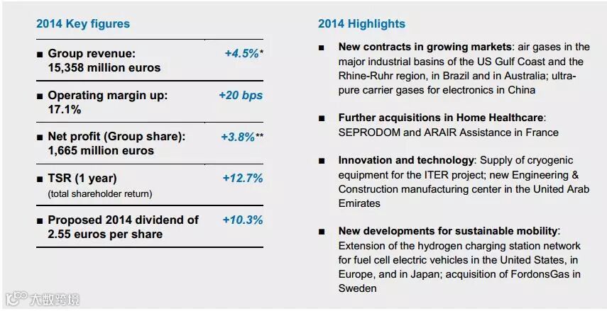 展望:2014年,“在这个复杂的——尤其以汇率和油价快速波动为标志的市场环境中,集团在销售额、运营利润率及现金流等方面均取得了稳步发展。尤其通过成功的成本控制以及大幅提升效率,液化空气集团对其在2015年实现净利润继续增长充满信心。