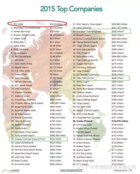 美国《涂料世界》(Coatings World,July 2015)杂志最新发布了《2015年全球顶级涂料制造企业销售额排行榜(2015 Top Companies)》,嘉宝莉、上海涂料、大宝三家中国企业榜上有名。