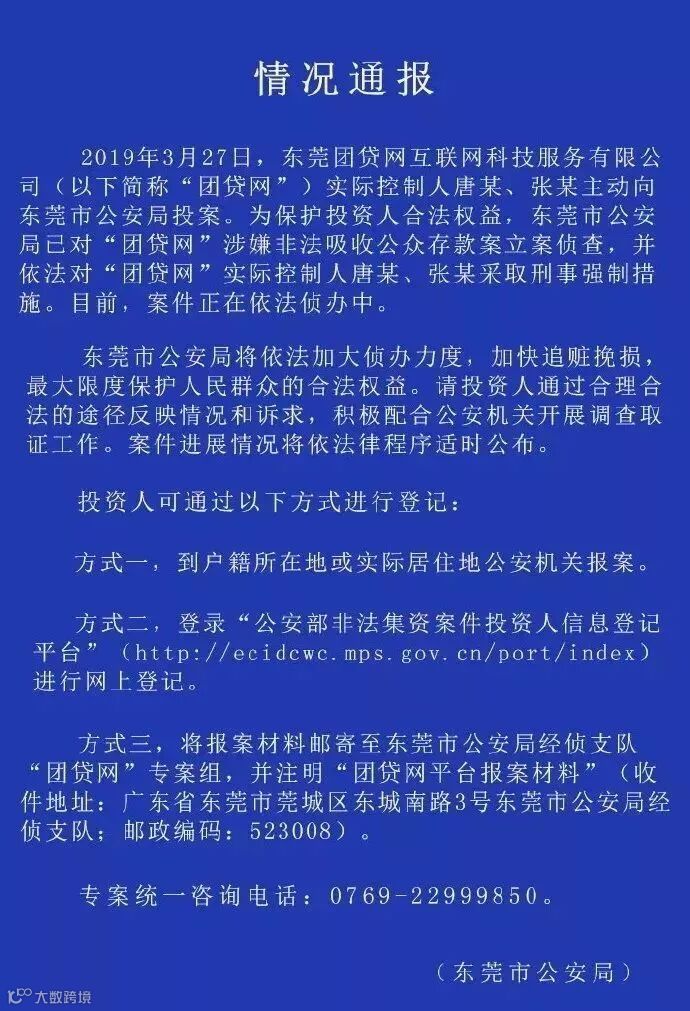 通报称,2019年3月27日,东莞团贷网互联网科技服务有限公司实际控制人唐某、张某主动向东莞市公安局投案。为保护投资人合法权益,东莞市公安局对“团贷网”涉嫌非法吸收公众存款案立案侦査,并依法对“团贷网”实际控制人唐某(唐军)、张某(张林)采取刑事强制措施。