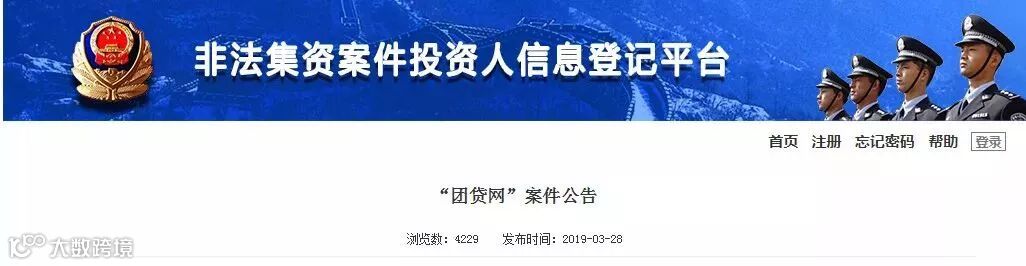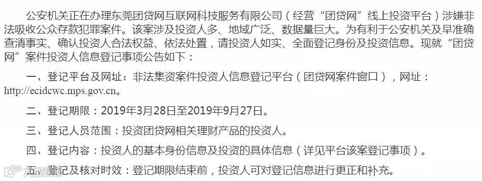 公安部非法集资案件登记平台已开通“团贷网案件窗口”,登记期限显示为2019年3月28日至2019年9月27日。