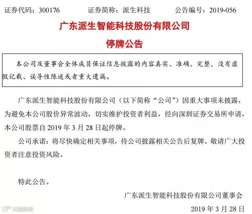 3月28日,上市公司派生科技紧急停牌,因重大事项未披露,为避免本公司股价异常波动,切实维护投资者利益,经向深圳证券交易所申请,本公司股票自2019年3月28日起停牌。
