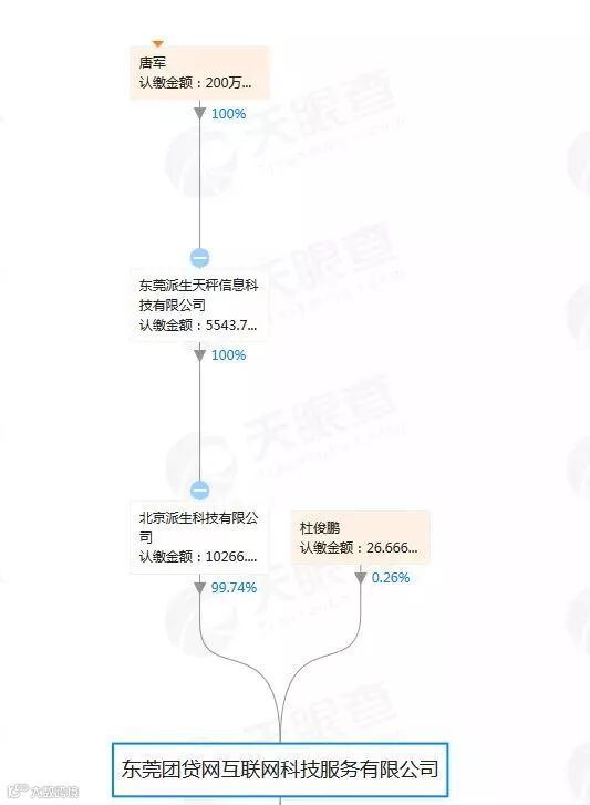 天眼查数据显示,东莞团贷网互联网科技服务有限公司成立于2016年2月,注册资本1.0293亿人民币,实缴资本7693.333万人民币,公司法人、执行董事及实控人均为唐军。大股东为北京派生科技有限公司,股权穿透后的实控人为唐军。