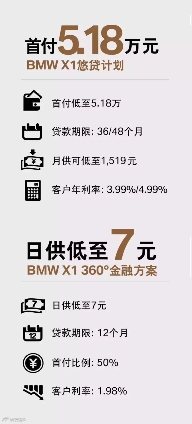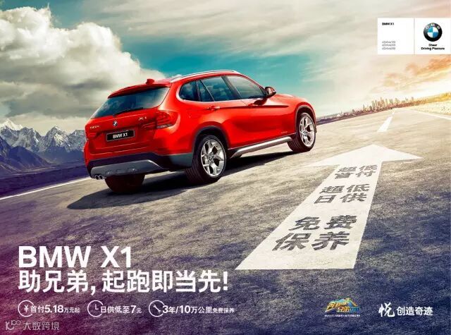 除免费养护惊喜外,BMW X1再次突破局限。首付5.18万元起或日供低至7元,让你摆脱按部就班的沉闷,跟随内心的自由即刻出发。