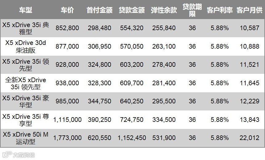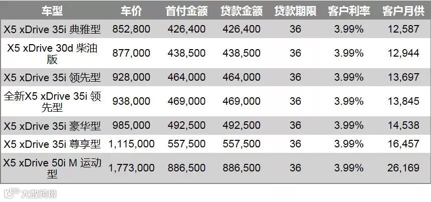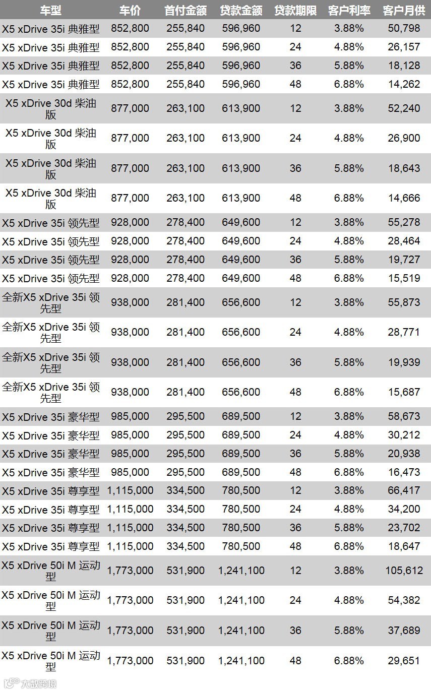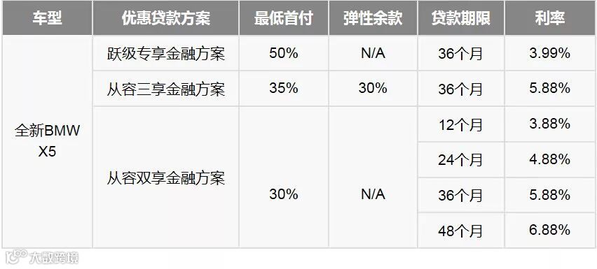 1. 全新BMW X5跃级专享金融方案,通过50%的高首付,低利率的方式,显著的降低了您的月供金额。这样可以有效缓解您每个月还贷负担。还贷少,低利率。给您更多选择,使您从容驾驭王者座驾!