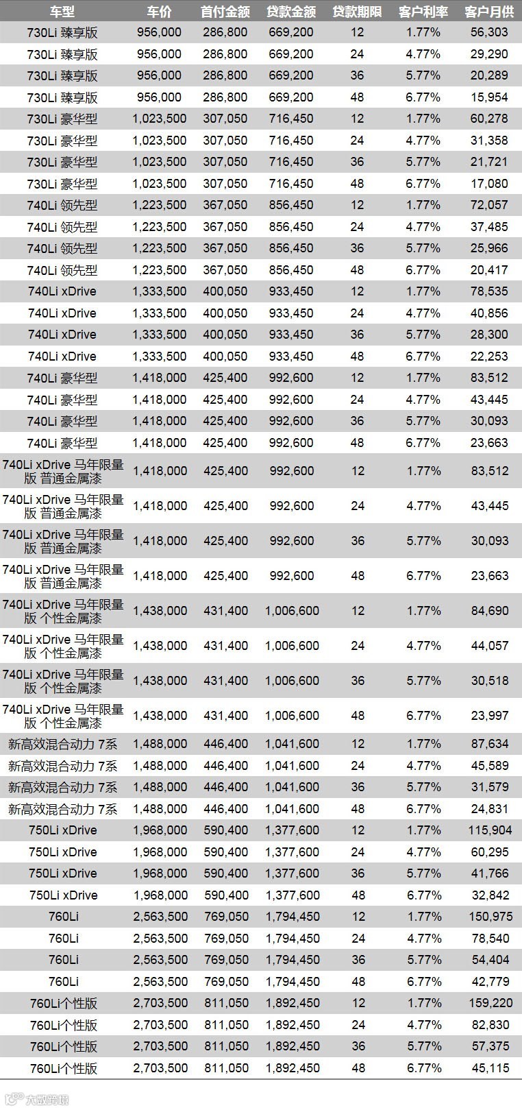 首付最低比例: 30%;贷款期限:12/24/36/48个月,客户利率:1.77%/4.77%/5.77%/6.77%。