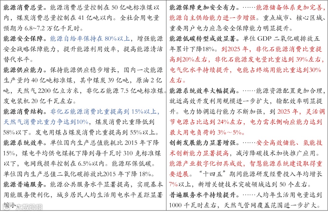 本期文章我们将《能源发展“十三五”规划》、《“十四五”现代能源体系规划》两部纲领性文件进行对比,看看我国对于能源工作的思路发生了哪些变化,对我们的投资又有哪些启发。
