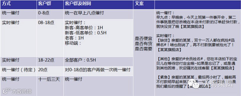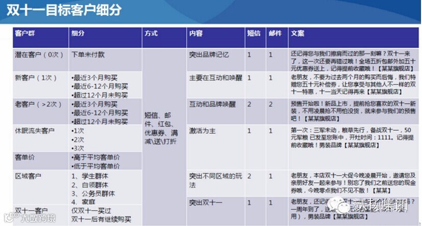 2丶订单催付:催付要做到细分,然后根据用户的行为突出文案,客户双11不付款的原因会是什么?从原因着手在短信上面去解决用户的疑虑,很多时候客户关注的点更多是在是否便宜丶是否有货丶是否需要这几个点上面,所以抓住这几个点入手,同时区分开新老客户,在文案上面做优化,例如加入亲爱的老客户来让自己和客户辨别自己的身份,提升用户的体验。