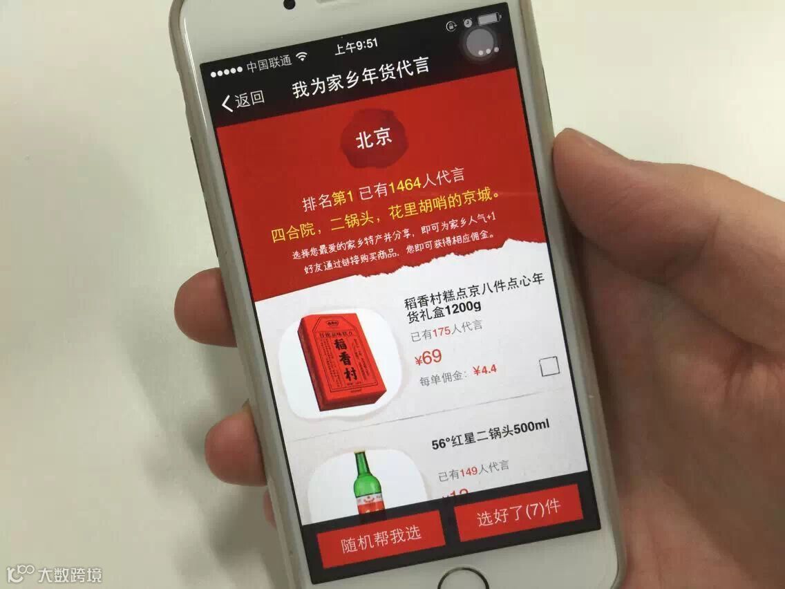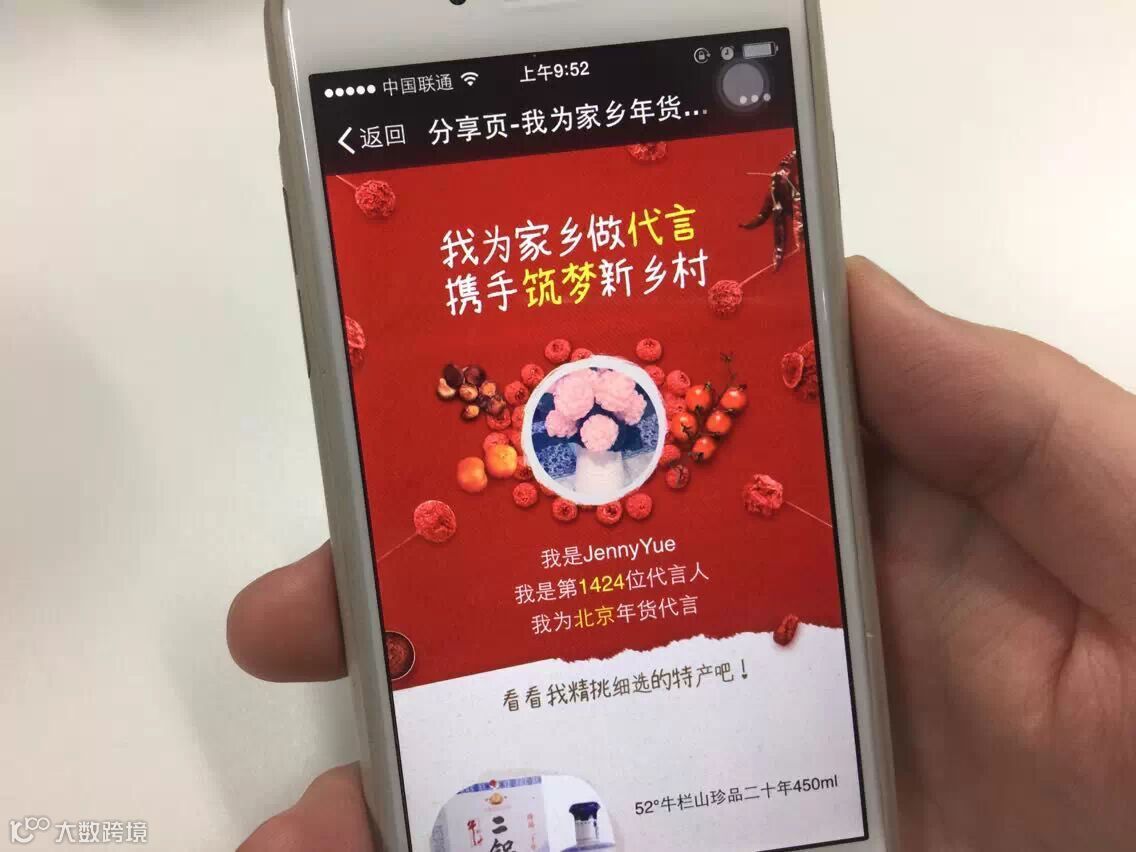据介绍,“我为家乡年货代言”活动从2月1日启动,一直持续到除夕夜(2月18日),消费者可以选择来自全国30多个地区的超过2千种最具地方特色的商品,不仅能自己购买,还能通过微信等社交工具分享给好友,把自己家乡最具特色的年货与好友分享。